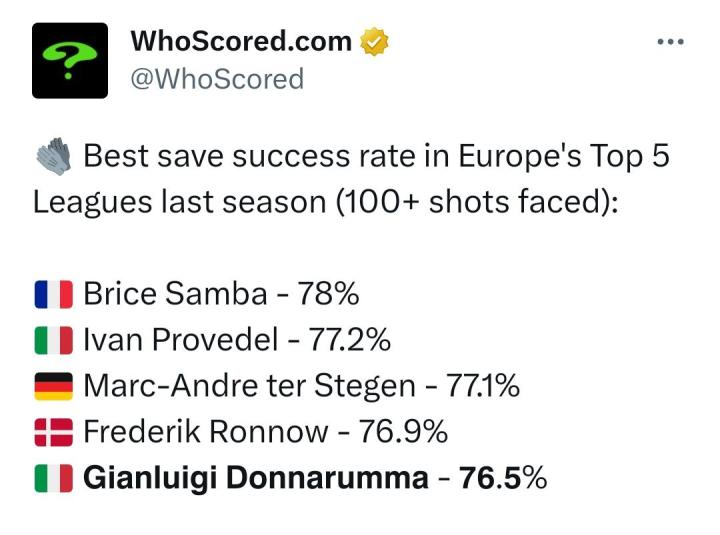 更厉害的是上赛季他的扑救成功率高居五大联赛第二位。