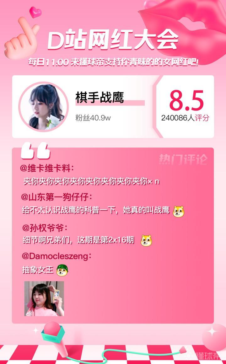 【棋手战鹰】1995年4月8日出生于河北省保定市,中国围棋运动员,围棋赛事讲解员,职业二段,人气主播。战鹰“出圈”为更多人所知,源于她一次“破防”流泪。“惨淡”的战绩被网友送以“八定王”的昵称。练习两年半抽象九段,2-16的傲人战绩深入人心。