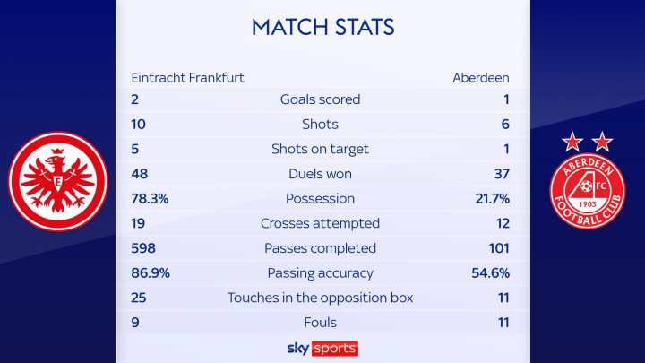 上半场8分26秒,埃宾贝在禁区内被犯规,马尔穆什把点球罚进,帮助法兰克福取得领先。尽管波尔瓦拉在11分钟后的进球让阿伯丁扳平比分,但下半场科赫在角球中头球顶进球门远角,还是让法兰克福拿到了一场胜利。
