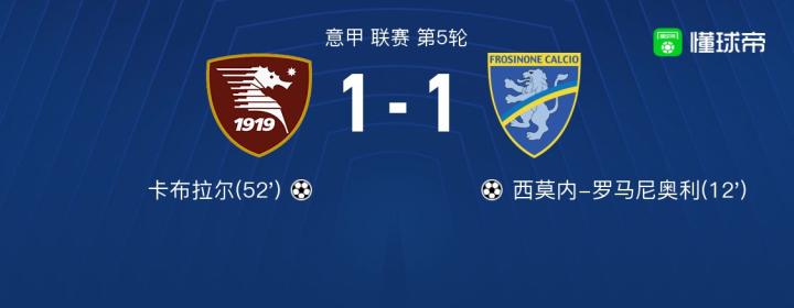 北京时间9月23日意甲联赛第5轮,萨勒尼塔纳主场对阵弗罗西诺内。萨勒尼塔纳卡布拉尔破门。弗罗西诺内西莫内-罗马尼奥利破门。最终比分1-1。