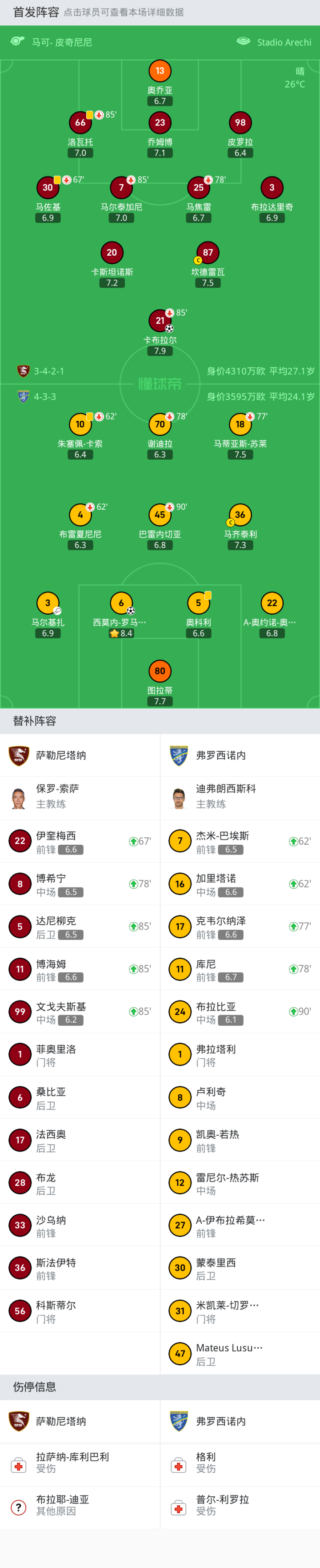 弗罗西诺内首发:6-西莫内-罗马尼奥利, 36-马齐泰利, 3-马尔基扎, 80-图拉蒂, 4-布雷夏尼尼, 10-朱塞佩-卡索, 5-奥科利, 22-A-奥约诺-奥姆瓦-托克, 70-谢迪拉, 45-巴雷内切亚, 18-马蒂亚斯-苏莱
