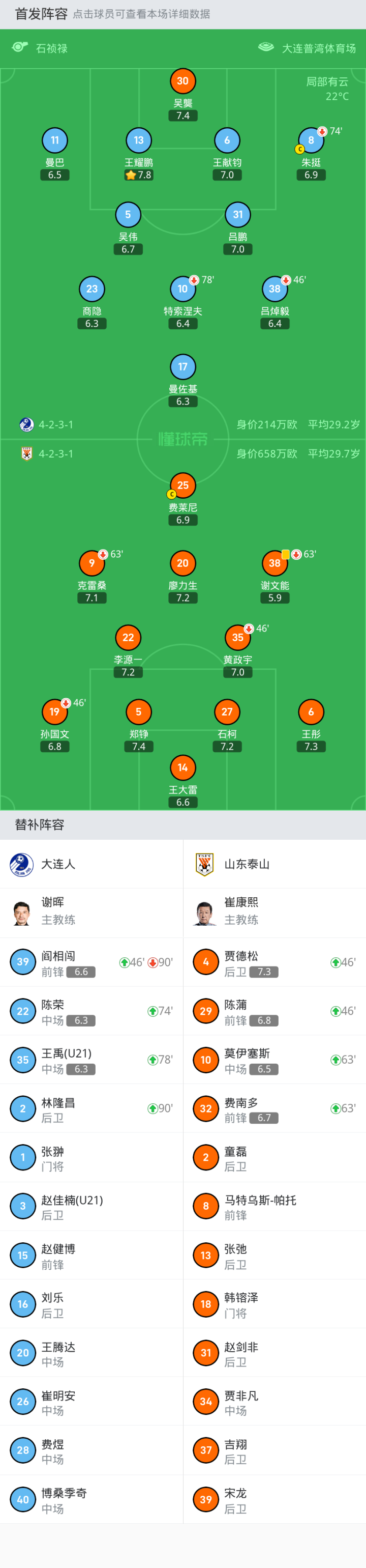 北京时间9月23日中超 联赛 第26轮,大连人主场对阵山东泰山,上半场费莱尼抽射被扑,吴龑多次扑救,下半场阎相闯丢单刀,陈蒲被拽倒未判点。最终比分0-0。