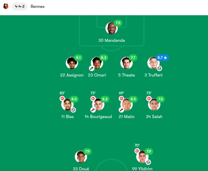 本场比赛结束后,雷恩本赛季已有10人取得进球。特吕费尔已代表雷恩出战三种不同的欧战赛事,终于收获了自己的欧战处子球。在本场比赛中,特吕费尔获评8.7分,创造了2次绝对得分机会,11次成功反抢球权,3次地面对抗全部获胜。
