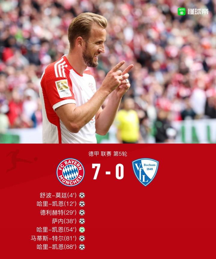 北京时间9月23日,拜仁慕尼黑在德甲联赛第5轮主场对阵波鸿。舒波-莫廷开场仅4分钟就为拜仁首开记录,随后凯恩上演帽子戏法并贡献两次助攻,德利赫特、萨内和马蒂斯-特尔也各入一球,最终拜仁主场7-0狂胜波鸿。