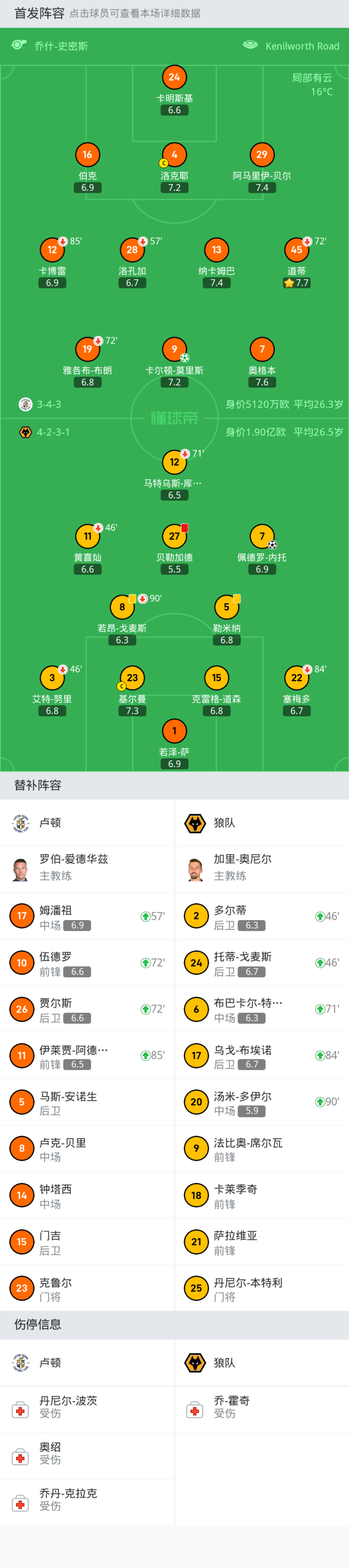 上场替补:72'10-伍德罗, 57'17-姆潘祖, 85'11-伊莱贾-阿德巴约, 72'26-贾尔斯