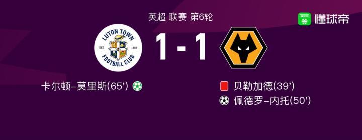 北京时间9月23日英超 联赛 第6轮,卢顿主场对阵狼队。此役,贝勒加德蹬踏被直红罚下,内托凭借个人能力反击内切劲射打破僵局,莫里斯点射救主。最终,卢顿主场1-1战平十人狼队,取得队史英超首分。