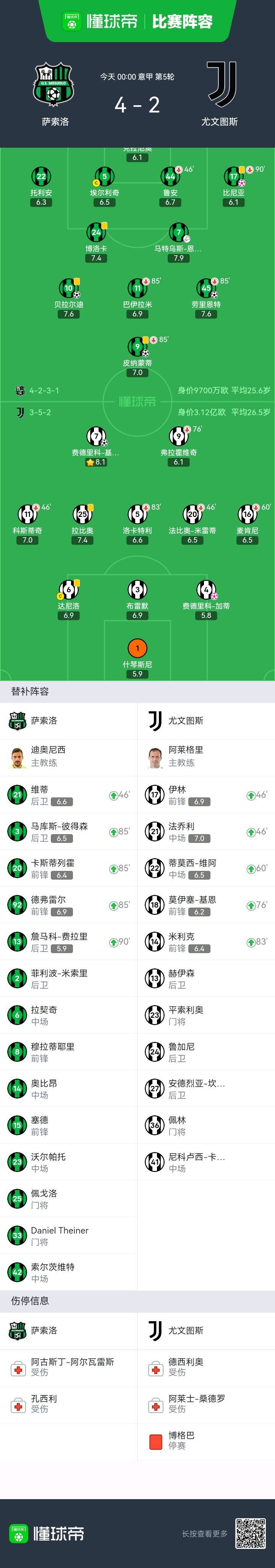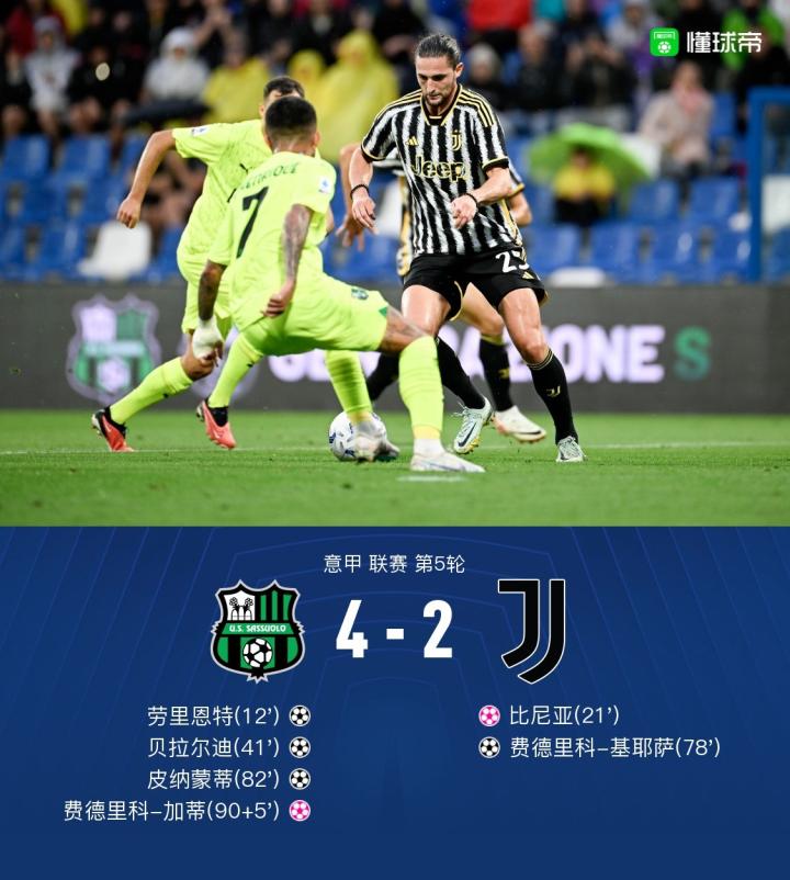 北京时间9月24日意甲 联赛 第5轮,萨索洛主场对阵尤文图斯。什琴斯尼手滑失误,劳里恩特劲射破门,贝拉尔迪兜射破门,皮纳蒙蒂补射破门,比尼亚自摆乌龙,费德里科-基耶萨门前劲射破门,费德里科-加蒂离谱将球回传进自家大门。最终比分4-2。