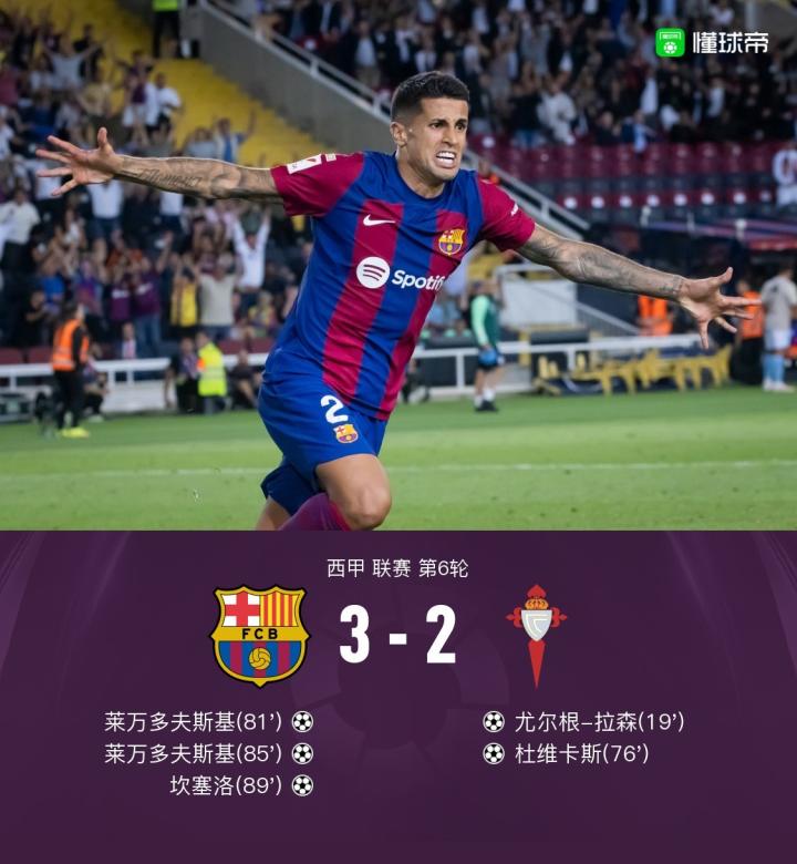 剑南春|巴萨让二追三3-2塞尔塔,坎塞洛绝杀+传射,莱万双响