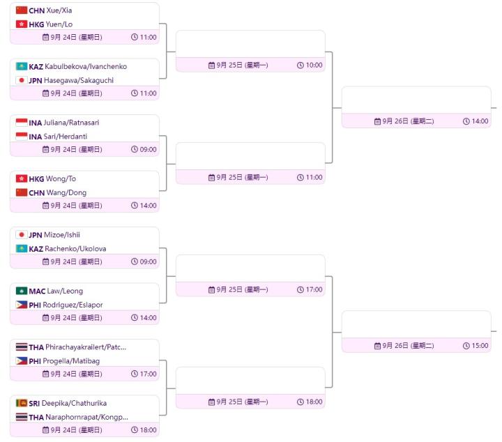 按照赛程安排,薛晨/夏欣怡将在1/4决赛迎战日本组合长谷川晓子/坂囗由里香;王凡/董颉将在1/4决赛对阵印尼组合朱莉安娜/拉特纳萨里。