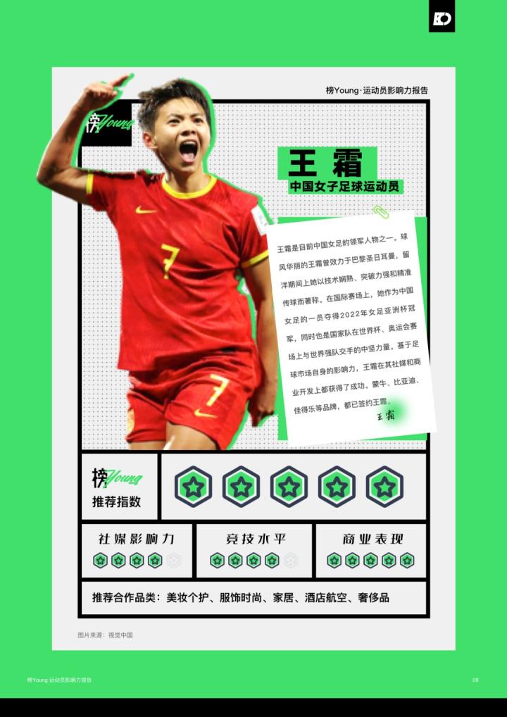 在针对王霜的影响力进行分析时,该媒体写道:“王霜是目前中国女足的领军人物之一,球风华丽的王霜曾效力于巴黎圣日尔曼,留洋期间她以技术娴熟、突破能力强和精准传球而著称。在国际赛场上,她作为中国女足的一员夺得2022女足亚洲杯冠军,同时也是国家队在世界杯、奥运赛场上与世界强队交手的中坚力量。”同时,对其品牌影响力的推荐指数给出了五颗星的高分。