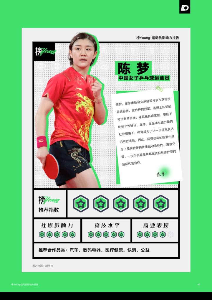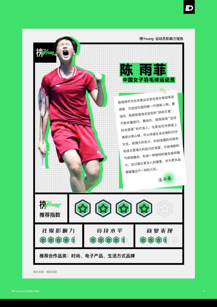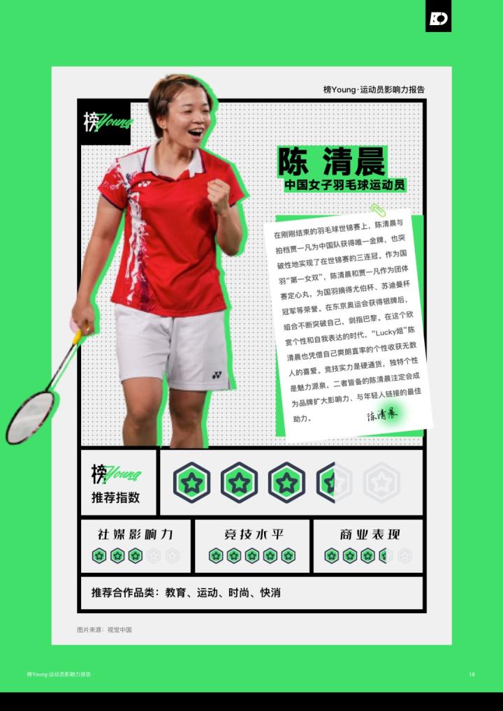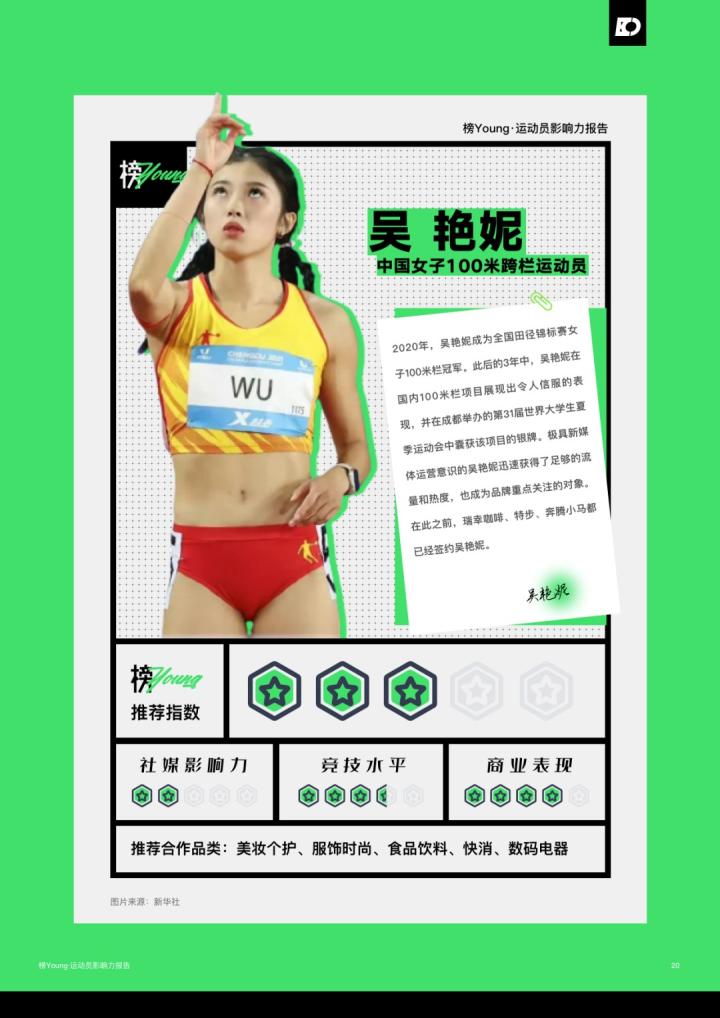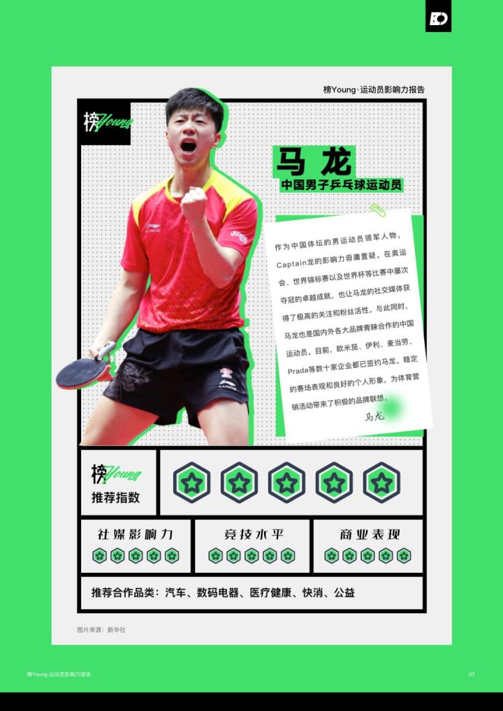 日前,氪体发布了基于目前运动员的特性和市场情况整合而出的《榜Young·运动员影响力报告》。该报告列举了目前中国最具影响力的20名运动员,其中马龙领衔榜单,而足球领域仅有王霜一名运动员上榜;此前出圈的吴艳妮、夏思凝等人也进入了榜单。