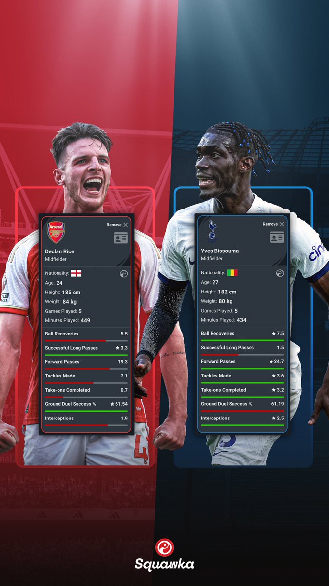 Squawka列出了赖斯和比苏马两人的基础资料和本赛季前5轮的一些数据对比: 赖斯(英格兰,年龄:24岁,身高:185cm,体重:84kg,本赛季英超出场:5场,总出场时间:449分钟) 比苏马(马里,年龄:27岁,身高:182cm,体重:80kg,本赛季英超出场:5场,总出场时间:434分钟) 场均成功反抢:赖斯5.5次,比苏马7.5次 场均成功长传:赖斯3.3次,比苏马1.5次 场均向前传球:赖斯19.3次,比苏马24.7次 场均做出铲球:赖斯2.1次,比苏马3.6次 场均完成带球过人:赖斯0.7次,比苏马3.2次 地面一对一成功率:赖斯61.54%,比苏马61.19% 场均抢断:赖斯1.9次,比苏马2.5次