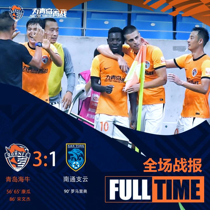 第65分钟,张卫在禁区内回做给王建明,王建明挑传助攻康瓜凌空斩破门完成梅开二度,青岛海牛2:0南通支云!