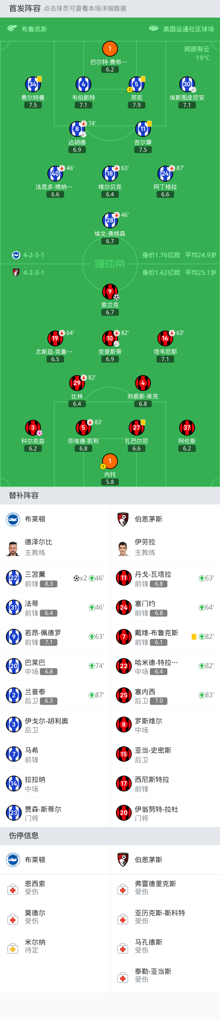 伯恩茅斯首发:1-内托, 10-克里斯蒂, 9-索兰克, 4-刘易斯-库克, 29-比林, 16-塔韦尼耶, 19-尤斯廷-克鲁伊维特, 37-阿伦斯, 5-劳埃德-凯利, 27-扎巴尔尼, 3-科尔克兹
