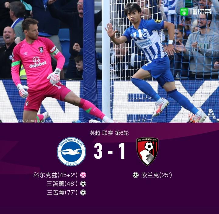 北京时间9月24日英超 联赛 第6轮,布莱顿主场对阵伯恩茅斯。布莱顿三笘薰梅开二度。伯恩茅斯索兰克破门,科尔克兹自摆乌龙。。最终比分3-1。