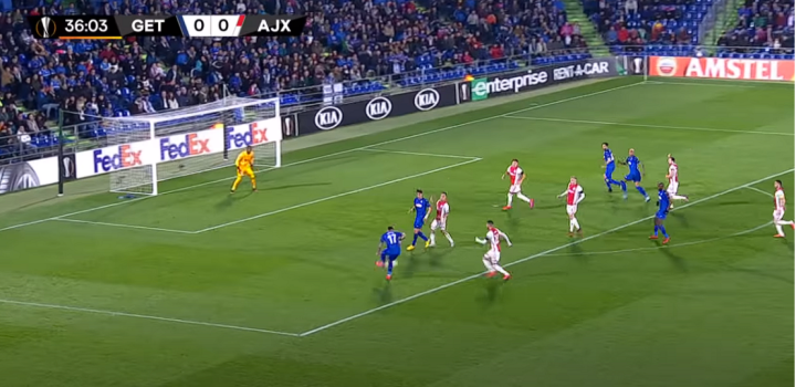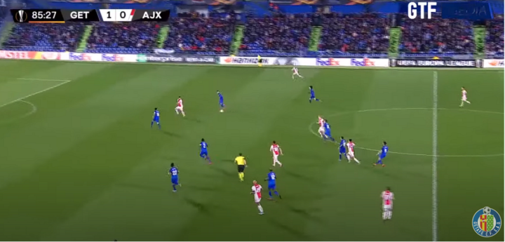 博尔达拉斯的边路内收贯彻到较为深入。无论是边后卫还是边前卫,只要边路没有防守任务都需要回撤到中路帮忙持球推进。这样的战术也起到了非常重要的效果。面对阿贾克斯全场最好的机会,正是因为边路球员的内收,后防线才有充足的人手防下来自亨特拉尔的本局比赛最有威胁的进攻