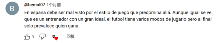 Google翻译:在西班牙,由于那里占主导地位的比赛风格,这种做法应该会受到反对。 虽然看上去他是一位有着远大理想的教练,但足球有多种玩法,但最终谁胜谁负还得由比赛说了算。