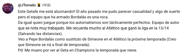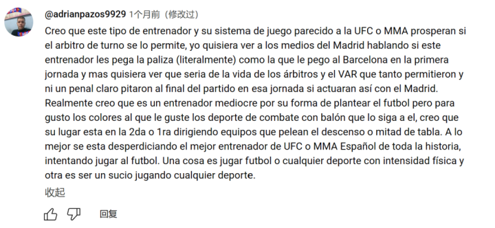 Google翻译:我认为,如果当值裁判允许的话,这种类型的教练和他类似于UFC或MMA的比赛体系会蓬勃发展。我希望看到马德里媒体谈论这位教练是否像他给他们的教练那样击败他们(字面意思) . 我在第一天对阵巴塞罗那,我真的很想看看裁判和 VAR 的生活会变成什么样子,他们允许了这么多,甚至在比赛结束时都没有判出明确的点球,如果他们与马德里队的比赛也是如此。 我真的认为他是一个平庸的教练,因为他对待足球的方式,但就颜色的味道而言,那些喜欢有球格斗运动的人应该跟随他,我认为他的位置是在第二或第一指挥球队中降级或中游。 也许历史上最好的 UFC 或西班牙综合格斗教练正在浪费时间去踢足球。 踢足球或任何体力强度较大的运动是一回事,而从事任何肮脏的运动又是另一回事。