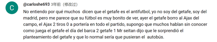 Google翻译:我不明白为什么很多人说赫塔菲反足球,我不是赫塔菲人,我来自马德里,但我觉得他们的足球很好看,昨天赫塔菲把阿贾克斯从场上抹掉了,阿贾克斯2次射门整场比赛0比0进球,我想很多人都在谈论不知道赫塔菲在巴萨第2天赫塔菲1的表现,塞坦先生说他对赫塔菲的做法感到惊讶,正常的事情是他们放大巴。
