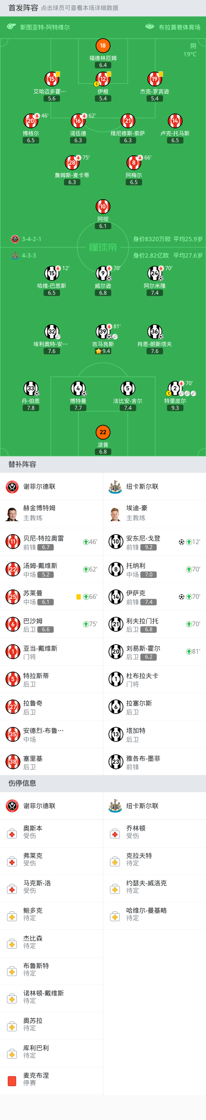 谢菲尔德联首发:16-诺伍德, 19-杰克-罗宾逊, 12-伊根, 18-福德林厄姆, 15-艾哈迈多霍吉奇, 20-博格尔, 8-阿梅尔, 21-维尼修斯-索萨, 14-卢克-托马斯, 10-阿彻, 28-詹姆斯-麦卡蒂