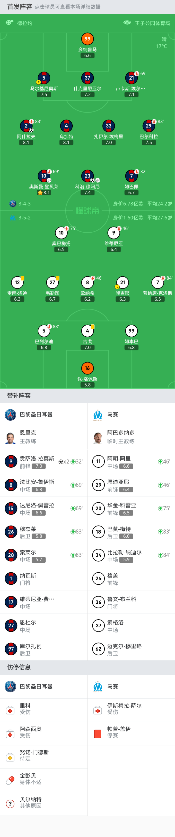 上场替补:69'15-达尼洛-佩雷拉, 83'26-穆杰莱, 69'8-法比安-鲁伊斯, 83'28-索莱尔, 32'9-贡萨洛-拉莫斯
