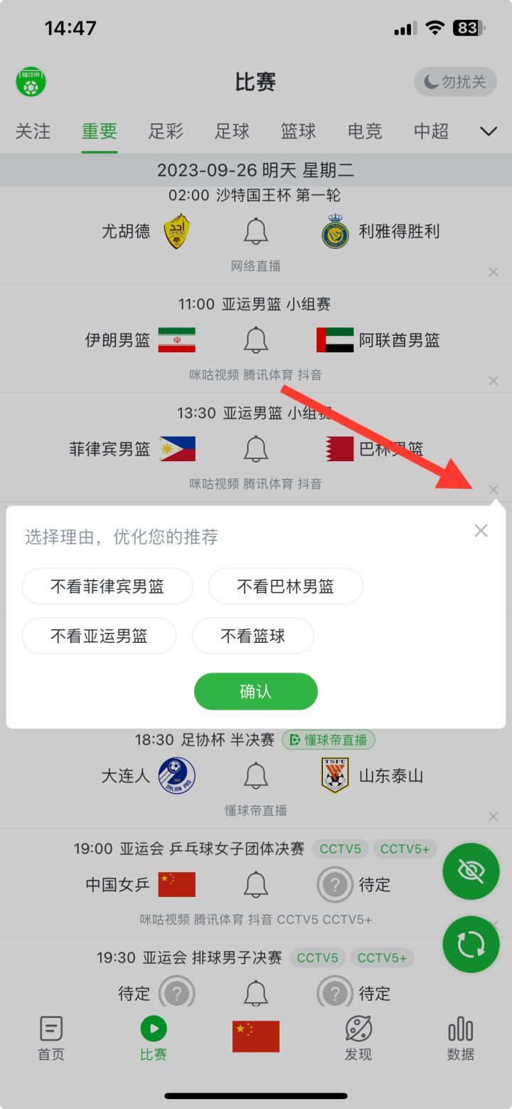 两步屏蔽不想看到的比赛:第一步,升级到最新版本;...懂球帝有数 @懂球帝2023-09-25 14:52两步屏蔽不想看到的比赛: 第一步,升级到最新版本; 第二步,点击比赛右下角的小叉叉,选择其中一个不想看的选项,确认。世界从此清净了有没有! 所以你会屏蔽哪些比赛呢?展开更多