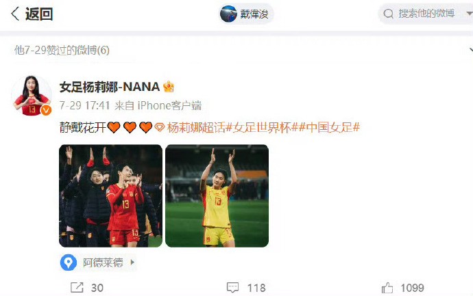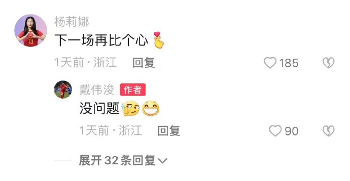 事实上,戴伟浚和杨莉娜的“恋情”早在几个月前就有所体现。7月份,女足世界杯期间,杨莉娜就在社交媒体上发布了“静戴花开”四个字。中国女足折戟世界杯后,杨莉娜更新动态:“感恩一路有你们的不离不弃,认清差距,继续努力。”戴伟浚则在那条动态下留言:“很棒了。”只不过,当时外界没有将两人联系起来。