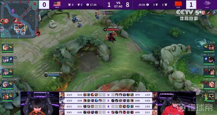 比赛第1分19秒,马来西亚队使用关羽率先拿下池晓铭(MING)的一血