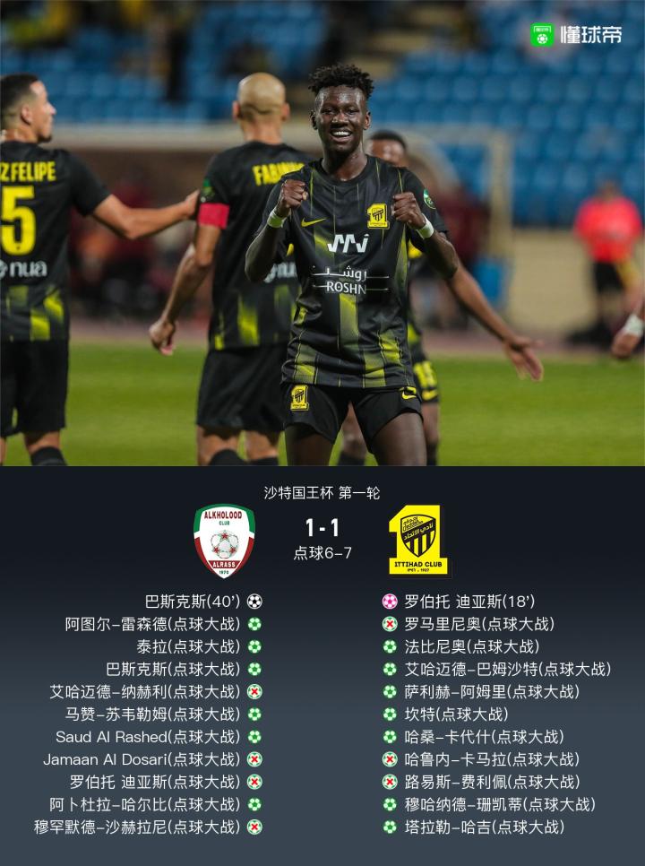 北京时间9月27日02:00,吉达联合在沙特阿拉伯国王杯第一轮客场挑战阿尔科鲁德。上半场罗伯托-迪亚斯打进乌龙球,半场结束前巴斯克斯为阿尔科鲁德扳平比分,此后双方再无建树,比赛在加时赛后进入点球大战。点球大战中双方共有7次失点,最终吉达联合总分8-7击败阿尔科鲁德晋级沙特国王杯第二轮。