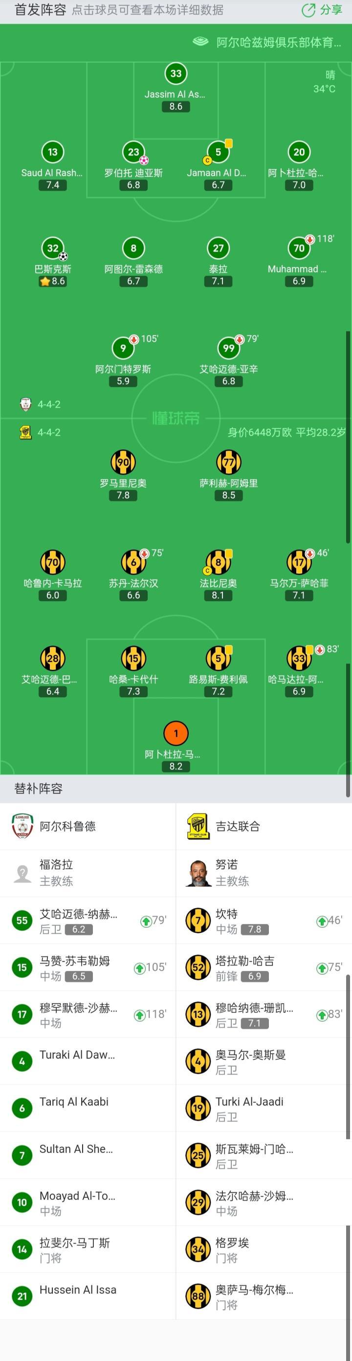 吉达联合首发:1-阿卜杜拉-马约夫、33-哈马达拉-阿洛赖扬、5-路易斯-费利佩、15-哈桑-卡代什、28-艾哈迈德-巴姆沙特、17-马尔万-萨哈菲、8-法比尼奥、6-苏丹-法尔汉、70-哈鲁内-卡马拉、77-萨利赫-阿姆里、90-罗马里尼奥