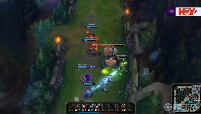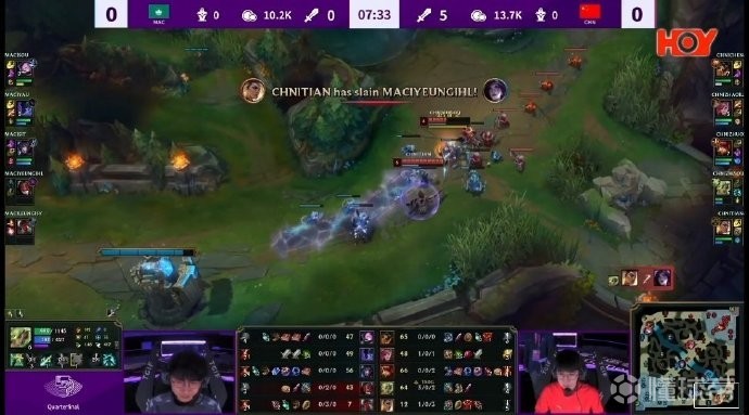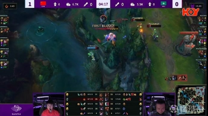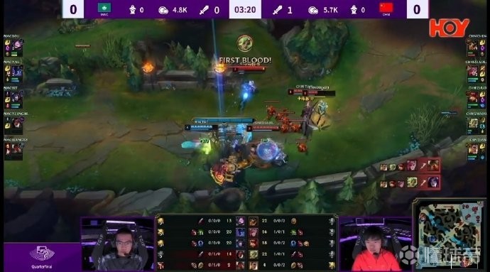 第3分钟,Jiejie蔚和knight安妮快速支援下路,中国队越塔完美4包2成功拿下两个积分。