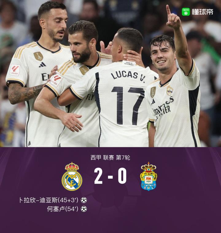 北京时间9月28日01:00,西甲第7轮继续进行,皇家马德里坐镇主场伯纳乌球场迎战拉斯帕尔马斯,本场主裁判为何塞-穆努埃拉。上半场,何塞卢屡失良机,阿拉巴伤退,迪亚斯最后时刻爆射破门。下半场,罗德里戈助攻何塞卢头槌建功。最终,皇马主场2-0击败拉斯帕尔马斯。