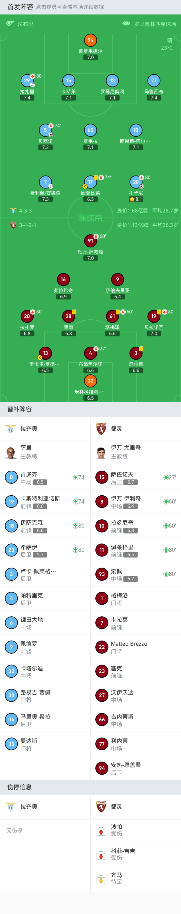 拉齐奥首发:17-因莫比莱, 5-贝西诺, 10-路易斯-阿尔贝托, 7-费利佩-安德森, 13-罗马尼奥利, 29-拉扎里, 77-马鲁西奇, 20-扎卡尼, 94-普罗韦德尔, 15-卡萨莱, 65-罗韦拉