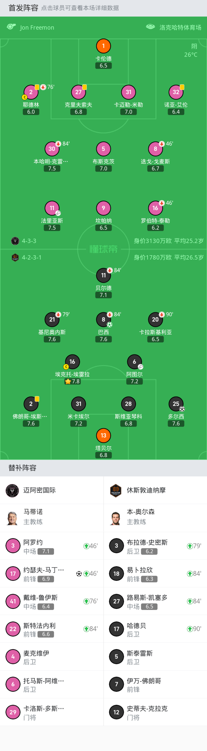 迈阿密国际首发:27-克里夫索夫, 5-布斯克茨, 16-罗伯特-泰勒, 2-耶德林, 31-卡迈勒-米勒, 9-坎帕纳, 11-法里亚斯, 1-卡伦德, 8-迭戈-戈麦斯, 32-诺亚-艾伦, 30-本哈明-克雷马斯基