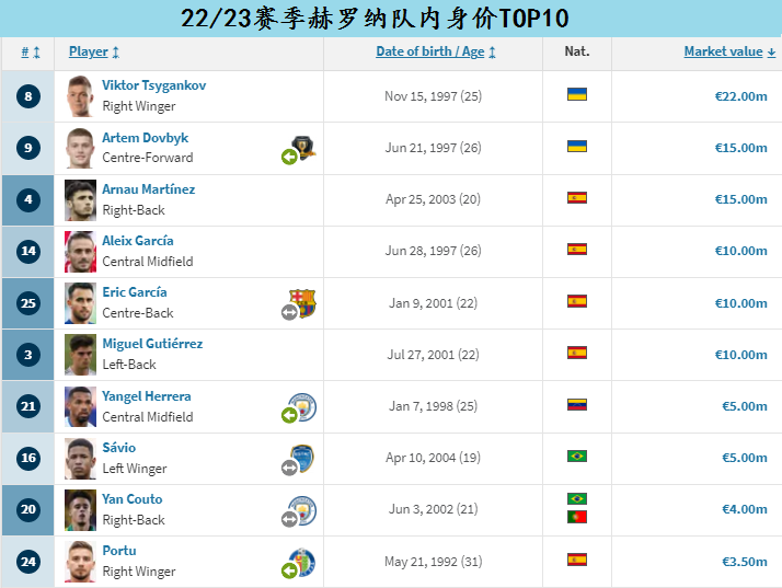 赫罗纳俱乐部在本赛季的球员总身价为1.253亿欧元,位列本赛季西甲球队身价榜的第13位,队内只有6名球员的身价超过1000万欧元。