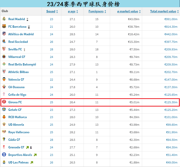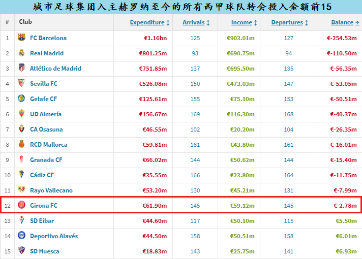 赫罗纳在今年夏季转会窗中的转会净投入仅约435万欧元,仅位列本赛季西甲球队净投入榜的第11位。