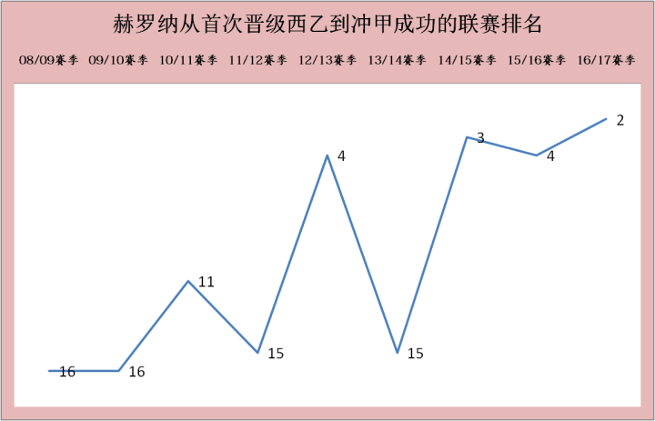 赫罗纳在西乙的前四个赛季一直苦苦保级,转机出现在12/13赛季,球队在时任主帅鲁比的带领下拿到了联赛第四名的好成绩并拿到了球队历史上的首个升级附加赛名额,可惜球队在附加赛决赛中0-4完败给阿尔梅里亚,赫罗纳险些创造历史。