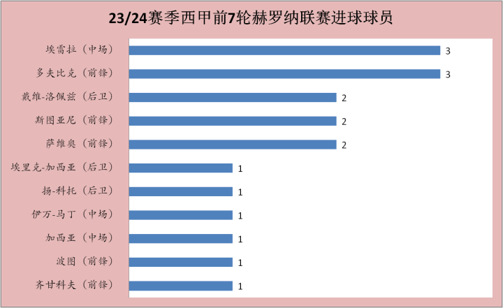 赫罗纳在本赛季的前7场比赛中打进了与巴塞罗那并列最多的18个进球,球队助攻数(13次)排名西甲第一,有多达9名球员取得进球,其中进球最多的多夫比克和埃雷拉也只打进了3个进球。此外队内也只有5名球员还没有在联赛登场,团队足球让赫罗纳的进攻全面开花。