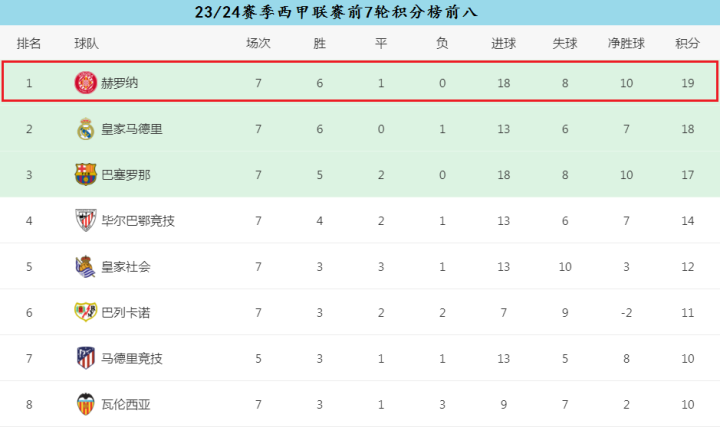 RMDLVP0110▎本赛季西甲七轮战罢,赫罗纳力压皇萨成为领头羊