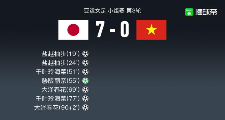 北京时间9月28日亚运女足 小组赛 第3轮,日本女足主场对阵越南女足。日本女足盐越柚步梅开二度,千叶玲海菜梅开二度,大泽春花梅开二度,胁阪丽奈破门。最终比分7-0。