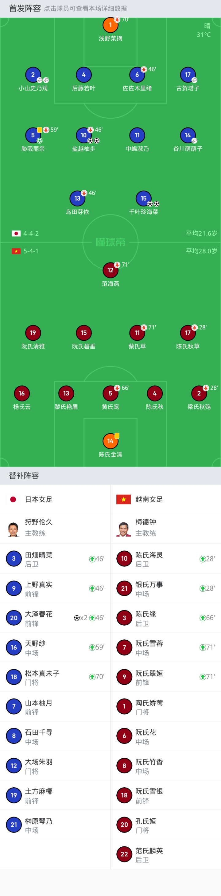 上场替补:46'9-上野真实, 70'18-松本真未子, 46'3-田畑晴菜, 59'16-天野纱, 46'20-大泽春花
