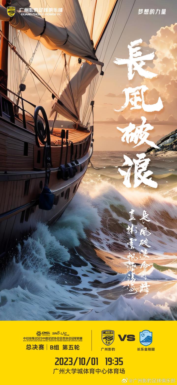 10月1日19:35,在2023中冠联赛总决赛分组赛B组第5轮中,广州影豹将在主场广州大学城体育中心体育场,迎战长乐金刚腿。9月28日,广州影豹足球俱乐部发布了此役的赛事海报,主题为:长风破浪。
