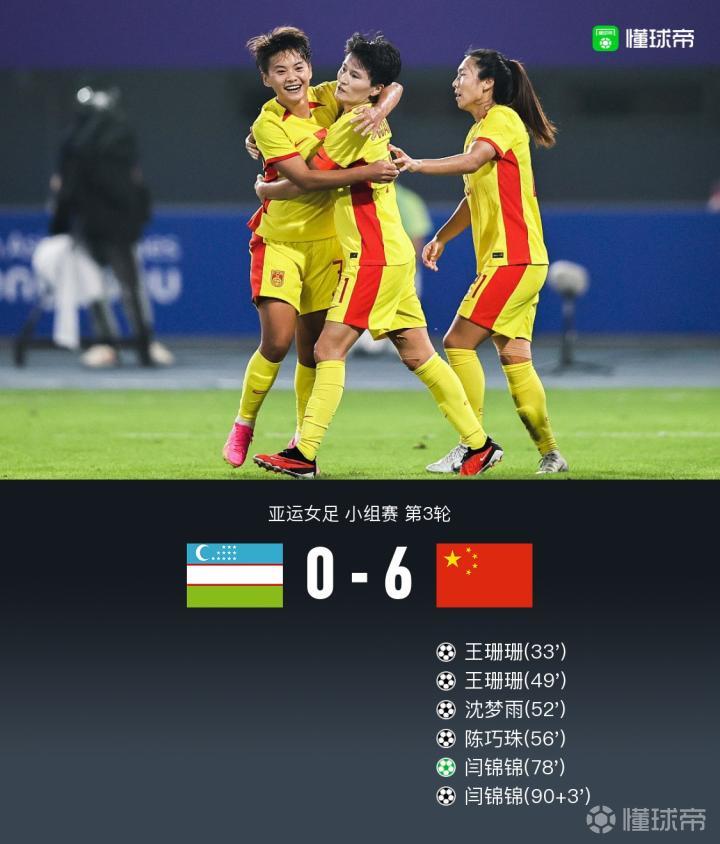 北京时间9月28日19:30,亚运女足小组赛A组第2轮展开较量,中国女足对阵乌兹别克斯坦女足。上半场李梦雯传中送出助攻,王珊珊头球破门打破场上僵局。下半场王珊珊破门完成双响,随后沈梦雨、陈巧珠破门锦上添花,之后的比赛闫锦锦造点,随后亲自主罚命中,补时阶段闫锦锦单刀冷静扣过回防球员,随后推射破门完成双响。全场结束,中国女足6-0战胜乌兹别克斯坦女足以小组头名出线,中国女足淘汰赛的对手是泰国女足。