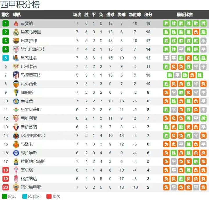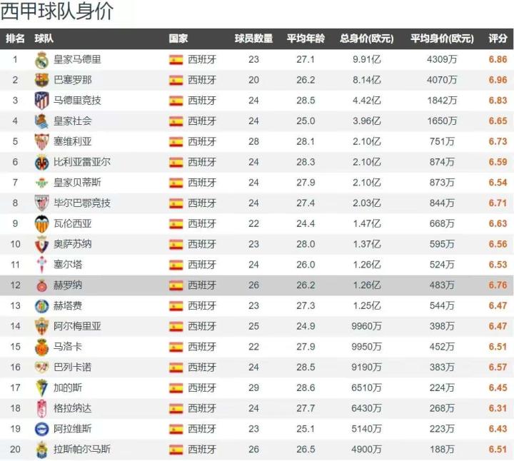 赫罗纳力压皇萨领跑西甲 7轮不败 全队身价仅为1.2亿欧 排名第12 你能想得到吗?西甲本赛季前7轮战罢,联赛积分榜的领头羊不是皇马,也不是巴萨,更不是马竞,而是赫罗纳。 赫罗纳前7轮西甲保持不败,6胜1平积19分,比皇马多1分,比巴萨多2分,领跑联赛积分榜。7场西甲打入了18个进球,与巴萨并列进球最多,仅丢了8球,并列西甲第六少。 赫罗纳只是一支平民球队,全队身价总和为1.26亿欧元,排名西甲第十一,而皇马全队身价总和为9.91亿欧元,巴萨全队身价总和为8.14亿欧元。如此一对比,更加能显得赫罗纳领跑西甲积分榜榜首的不容易,真是名副其实的黑马本色。 赫罗纳本赛季西甲前7轮战况:客场1-1皇家社会、主场3-0赫塔菲、客场2-1塞维利亚、主场1-0拉斯帕尔马斯、客场4-2格拉纳达、主场5-3马洛卡、客场2-1比雷亚雷亚尔。西甲下轮将迎来榜首大战,赫罗纳vs皇马,此役将真正考验赫罗纳的实力。
