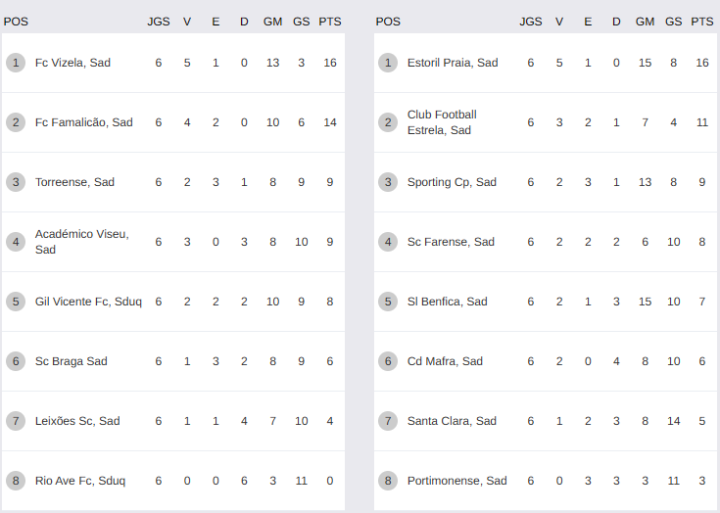葡超联赛资讯葡萄牙U23联赛新赛季已经进行到第6轮,U23联赛按照南北区划分为A、B两个小组,每一组有8支球队,以循环赛的赛制完成小组阶段。目前南北区的榜首位置分别是埃斯托里尔U23和维泽拉U23。