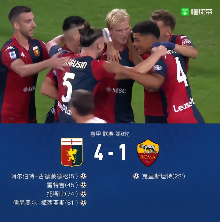 北京时间9月29日意甲 联赛 第6轮,热那亚主场对阵罗马。热那亚阿尔伯特-古德蒙德松破门,雷特吉破门,托斯比破门,儒尼奥尔-梅西亚斯破门。罗马克里斯坦特破门。最终比分4-1。