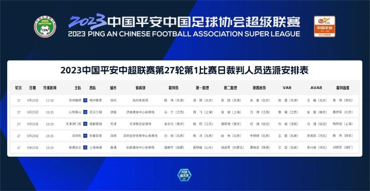 9月29日,中秋佳节,2023赛季中超联赛依然激战正酣。当天,第27轮将先赛5场。赛前,中超官方公布了这5场比赛的裁判人员选派安排。