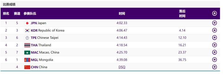 值得一提的是,中国队已经连续3届亚运会在该项目上被取消成绩。2014年仁川亚运会,中国队因为第三棒蝶泳陆滢潜泳出15米线被判犯规取消成绩;2018年雅加达亚运会,中国队因张雨霏交接棒时抢跳犯规被取消成绩。