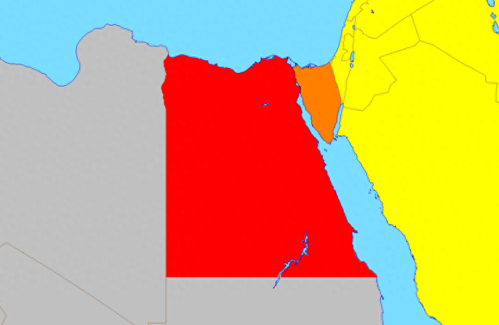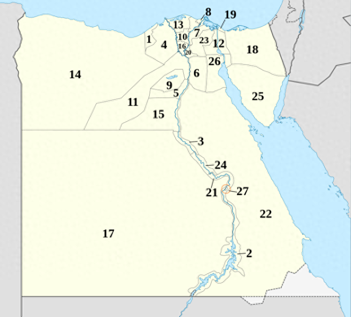 埃及全国共有27省。西奈半岛主体被分为北西奈省(下图18)和南西奈省(下图25)两省。