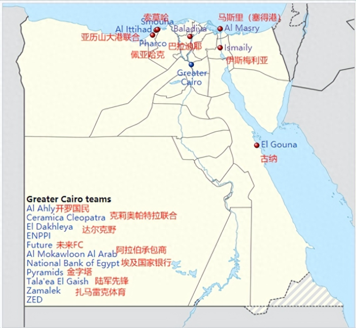 新赛季埃及联赛分布呈现一个特点:主要集中分布在首都开罗以及周边的吉萨、十月六日城、舒卜拉海迈和奥伯市组成的大开罗都会区以及第二大城市亚历山大港。